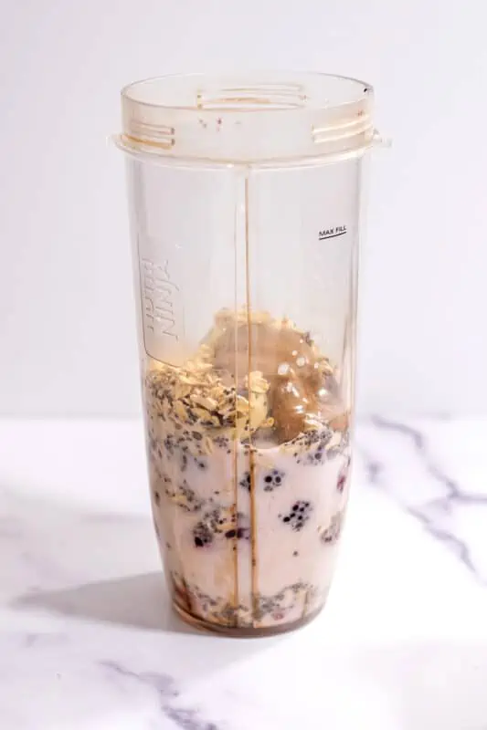 - Add all the ingredients to a high speed blender in the order listed.½ cup frozen strawberries, ½ cup frozen blackberries, ½ cup banana, ¼ cup rolled oats, 1 tbsp almond butter, 1 cup dairy free milk, 1 tablespoon chia seeds
