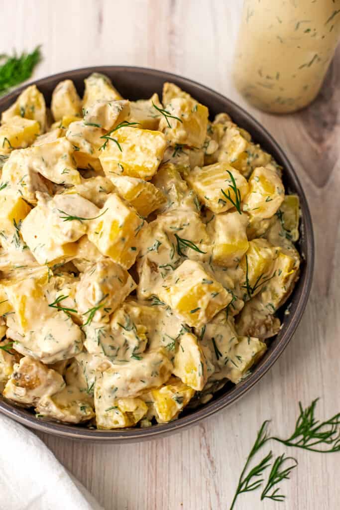 Vegan dill potato salad is great for picnics, cookouts, or weeknight meals. This dill tahini potato salad has no mayo and is the perfect summer side dish. The best part, this creamy dill potato salad can be made in advance and is even better the next day.